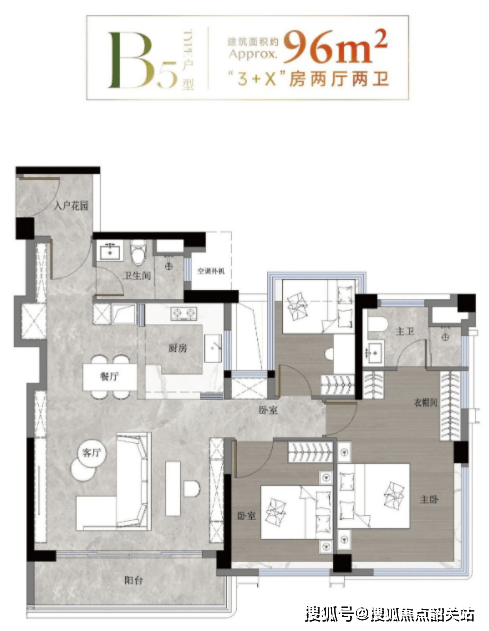 96平方米的三房户型则在空间尺度上进行了进一步的优化。餐客厅一体化设计,搭配宽景阳台,使得公共活动区域显得格外宽敞明亮。宽景阳台不仅提供了休闲观景的场所,还引入了更多的自然光线和新鲜空气,提升了整个房间的通风采光效果。卧室空间也更加阔绰,主卧足以放下双人床、衣柜和梳妆台,次卧也能舒适地容纳儿童床和书桌。这款户型适合对居住舒适度有一定要求的刚需家庭,既保证了功能性,又兼顾了舒适性,是进阶型置业的理想选择。