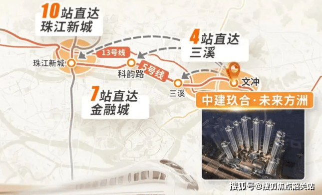 地铁5号线是广州东西向的交通大动脉,被誉为广州的“黄金走廊”。它串联起了荔湾、越秀、天河、黄埔四大核心区,途经环市路、天河路、珠江新城等繁华商圈。从中建未来方洲出发,搭乘5号线站即可直达珠江新城,全程耗时约25分钟。这意味着,居住在方洲的居民,早上可以多睡半小时,依然能从容地抵达广州最核心的商务区上班。无论是去国贸、国金中心,还是去各大金融机构、互联网大厂,5号线都能提供快速直达的服务。对于在天河CBD工作的精英人士来说,这条线路简直就是为他们量身定制的通勤专线号线则是广州东部的高速快线公里,是连接中心城区与增城、东莞的重要通道。13号线的站点间距大、运行速度快,能够快速衔接金融城、琶洲、鱼珠等核心CBD区域。从中建未来方洲附近的双岗站上车,只需几站即可到达鱼珠站,在这里可以换乘通往琶洲的线路,或者直接前往金融城北区。通过13号线分钟内到达广州东部的各个就业中心,甚至可以通过换乘轻松抵达白云机场、广州南站等交通枢纽。双地铁的叠加效应,使得中建未来方洲的通勤辐射范围大大扩展,线分钟通勤圈”覆盖天河、黄埔主要就业区的目标。